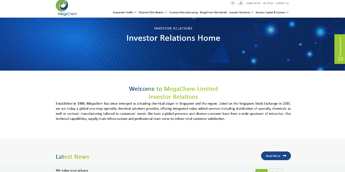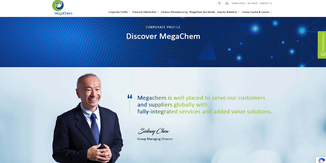 Established in 1988, Megachem has since emerged as a leading chemical player in Singapore and the region. Listed on the Singapore Stock Exchange in 2003, we are today a global one-stop specialty chemical solutions provider, offering integrated value-added services including distribution of specialty chemicals as well as contract manufacturing tailored to customers' needs.